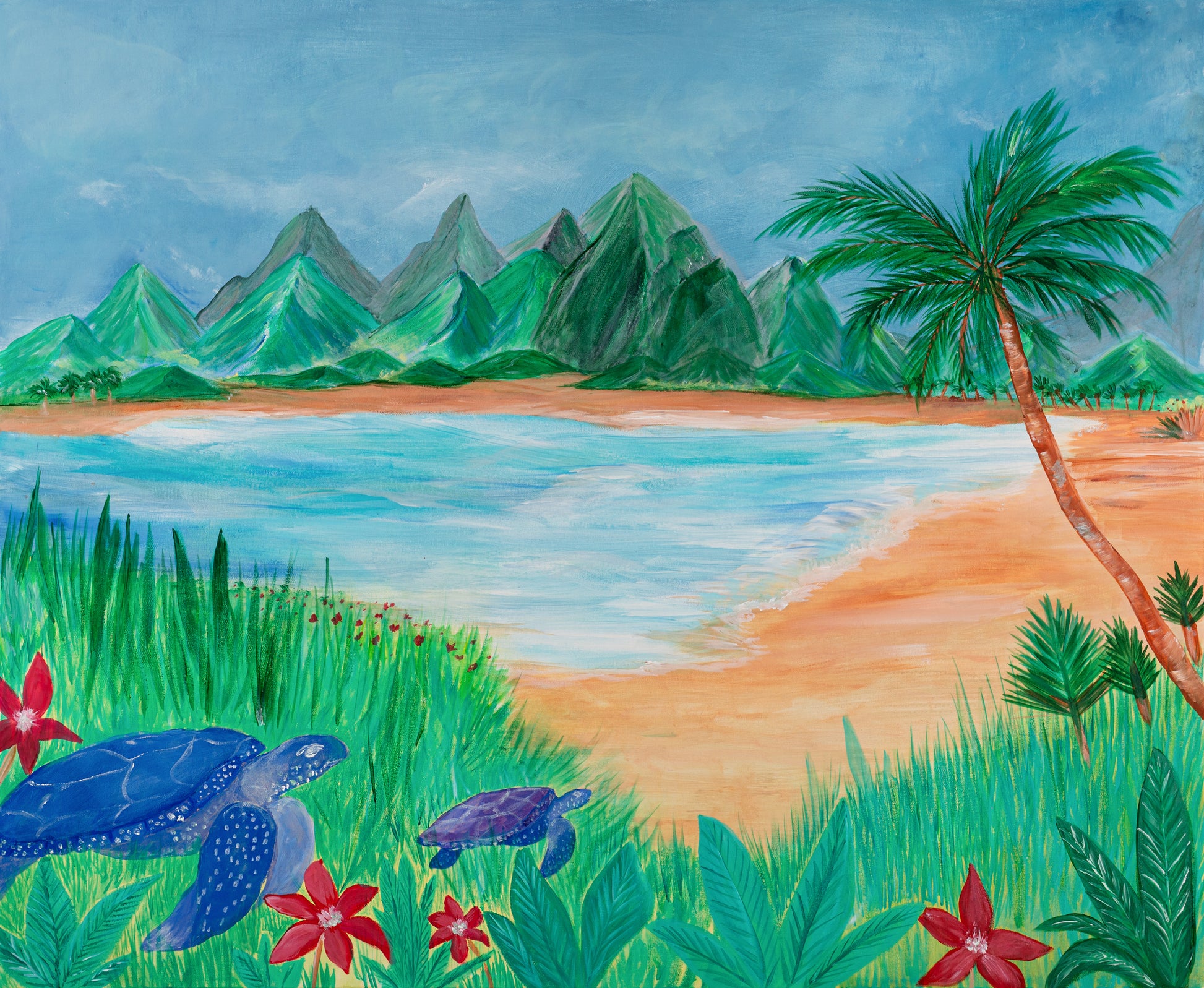 Eine tropische Landschaft, die die entspannte und paradiesische Atmosphäre Hawaiis widerspiegelt. Die sanften Grüntöne der Palmen, das azurblaue Meer und die warme Abendsonne verleihen dem Werk eine harmonische Balance zwischen Leichtigkeit und Lebendigkeit. Dieses Bild lädt dazu ein, den Alltag hinter sich zu lassen und in das Gefühl von Freiheit und Abenteuer einzutauchen.