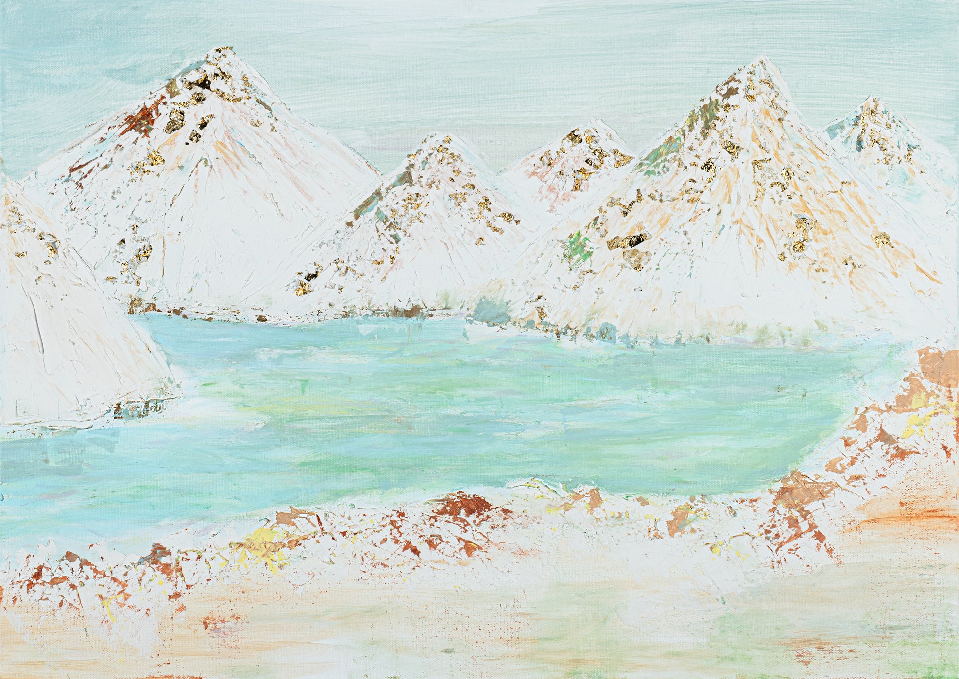 Eine Hommage an die majestätischen Gipfel des Himalayas und die ruhige, fast spirituelle Atmosphäre der Berge. Die Kombination aus Acrylfarben, Strukturpaste und Blattgold verleiht diesem Werk eine besondere Tiefe und Haptik. Während die Strukturpaste die raue, unberührte Schönheit der Berge nachbildet, sorgt das Blattgold für einen subtilen, reflektierenden Glanz, der die Erhabenheit und Magie der Landschaft unterstreicht.