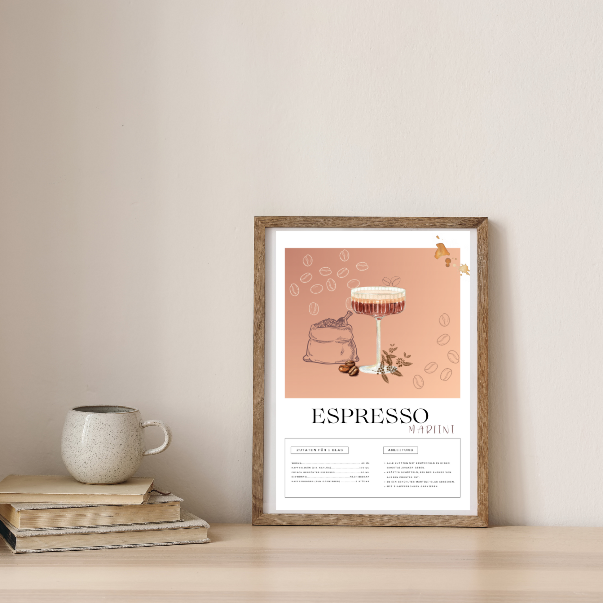 Bringe die Eleganz und den Genuss eines kultigen Cocktails in dein Zuhause! Dieses stilvolle Poster „Espresso Martini“ ist perfekt für Kaffeeliebhaber und Cocktailfans gleichermaßen. Mit seiner warmen, modernen Farbpalette und den liebevollen Illustrationen von Kaffeebohnen, einem Martini-Glas und einem Sack voller Kaffeearomen, schafft es eine gemütliche und zugleich edle Atmosphäre.
